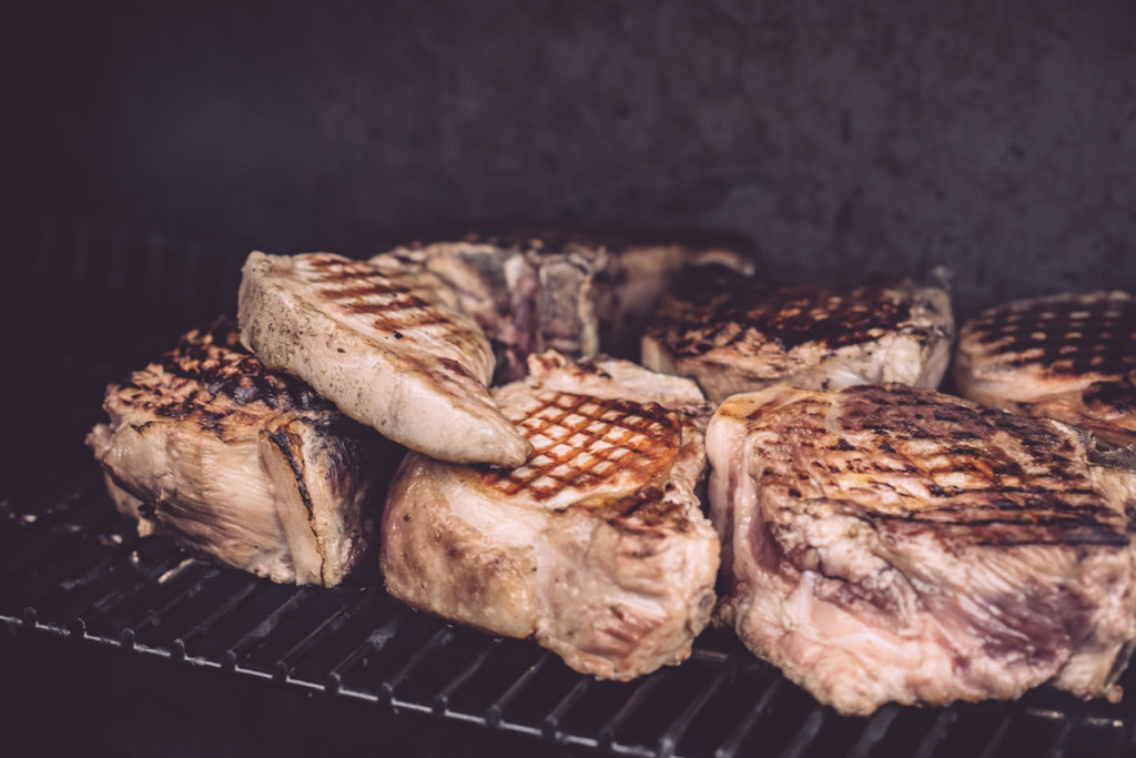 Na dann doch lieber ein paar Stücke vom Duroc aus dem Hause TOPIGS-SNW. Diese neu gezüchtete Spezialität steht nämlich heute auf dem Programm. Die Steaks dürfen auch gerne zwischen 400 und 600 Gramm wiegen, denn: „Alles andere ist Carpaccio“, wie der Kölner so sagt. Der wahre Grund ist natürlich, dass das Fleisch genug Zeit bekommt von außen das Grillaroma anzunehmen und dabei von innen nicht austrocknet. Übrigens waren alle Teile vom Duroc eher rosa statt gut durch. Koch und Grillmeister Sebastian meinte dazu nur: „Kühlkette eingehalten, deutsche Vorschriften eingehalten und eine super Fleischqualität. Da muss das Fleisch auf dem Grill nicht gequält werden.“ Und wenn man dann nach dem Essen den ca. 3 m hohen übergroßen Kugelgrill im Hof betrachtet, denkt man schon: „Echt göttlich!“